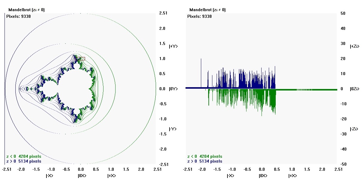 Here is pseudocode and the resulting graph for the Mandelbrot set where (x² - y², 2.0*x*y) is the build. y remains constant while △kᵢ = zᵢ in the x-direction is calculated. Each pixel referenced by the start point(i, j) is plotted when zᵢ ≠ 0.
